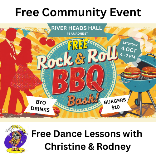 Get ready to dance, laugh, and have a blast at our Free Rock & Roll BBQ Bash! Saturday 4 October 4:00pm – 7:00pm River Heads Community Hall, 45 Ariadne Street,
